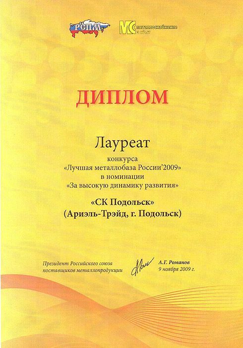 Лучшая металлобаза России2009 «За высокую динамику развития» СК «Подольск» 9 ноября, Москва