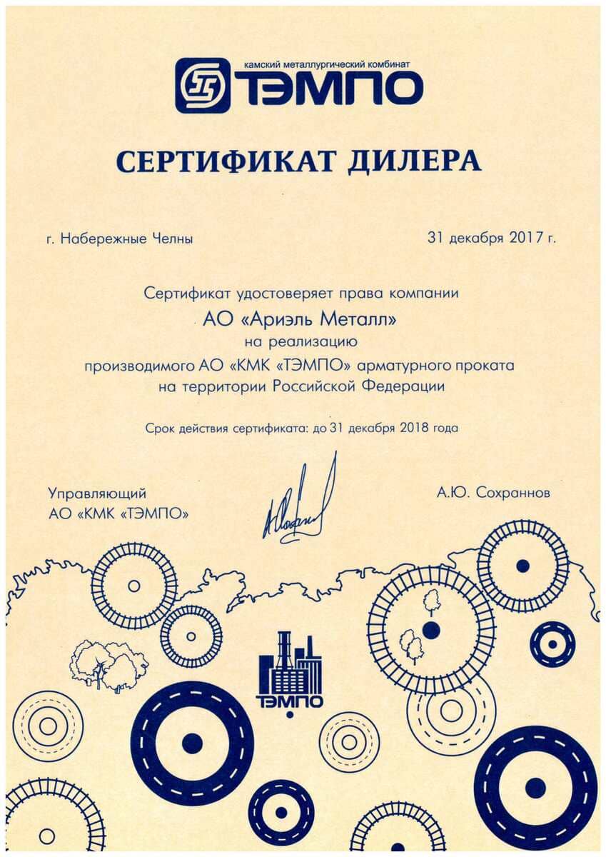 Сертификат партнера Публичного акционерного общества "Ашинский металлургический завод"